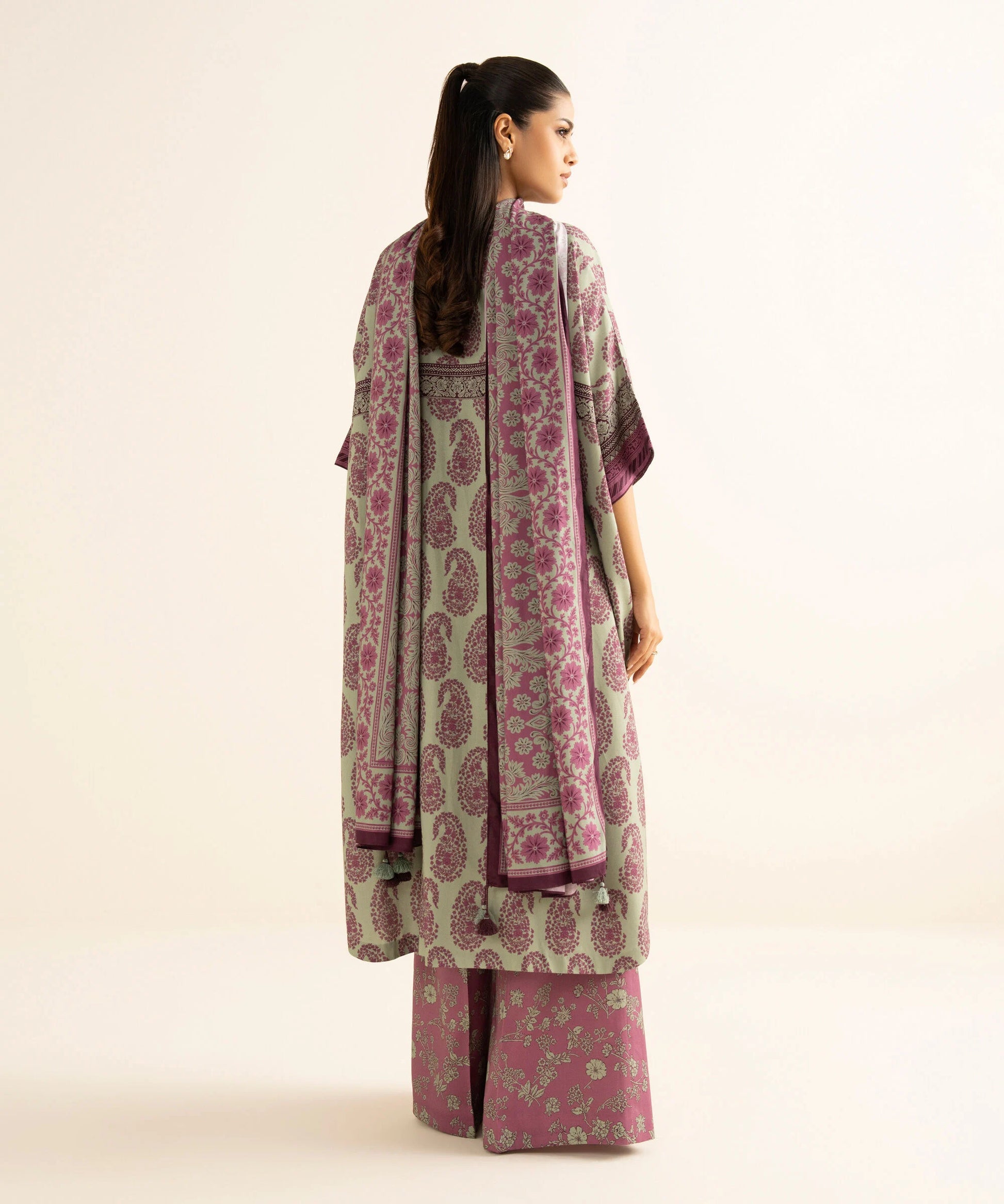 Make a statement with our three-piece printed pink and off white ensemble featuring a khaddar shirt and trousers paired with a matching dupatta.